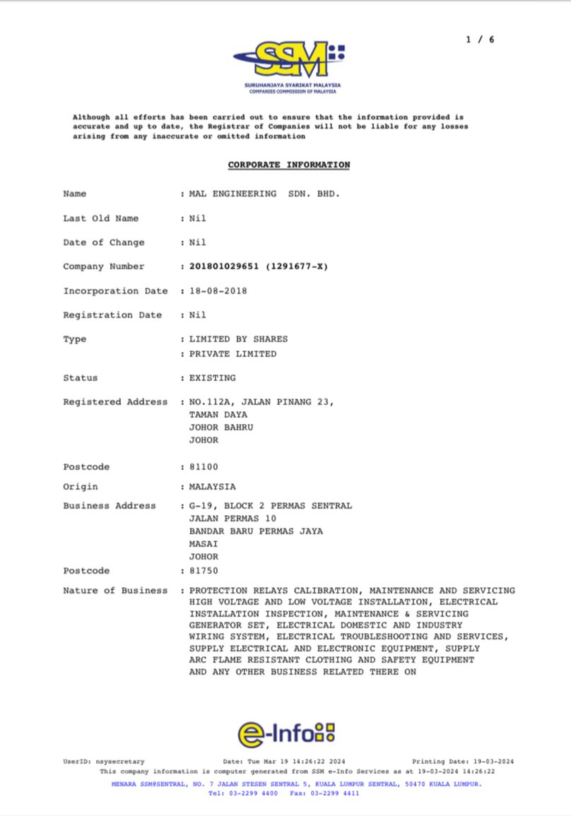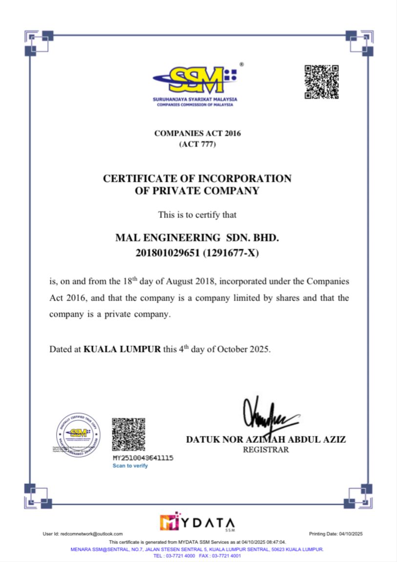 MAL ENGINEERING SDN BHD is a 100% Bumiputera-owned company, established in 2018 by Muhammad Ain Bin Lokman. With over six (6) years of industry experience. The company focuses on delivering high-quality engineering services, prioritizing customer satisfaction, and continuously improving its operations and services performance.